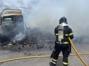 Uma carreta carregada de coco pegou fogo na manhã desta quinta-feira (26), na BR-101, no trecho entre os municípios de Parnamirim e Macaíba. De acordo com o Corpo de Bombeiros Miltiar do Rio Grande do Norte, o veículo foi tomado pelas chamas, mobilizando o trem de socorro completo da corporação, com equipes de combate a incêndio, salvamento e resgate. Dois caminhões de combate ao fogo foram empregados na ocorrência.