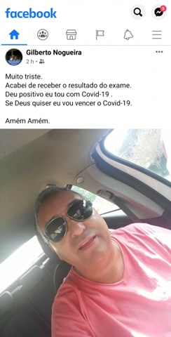 Gilberto Nogueira, ex-vice-prefeito de Macaíba, foi diagnosticado com covid-19. Em seu post, Gilberto revelou que estava muito triste com o resultado do exame, mas que estava otimista que iria vencer a doença.
