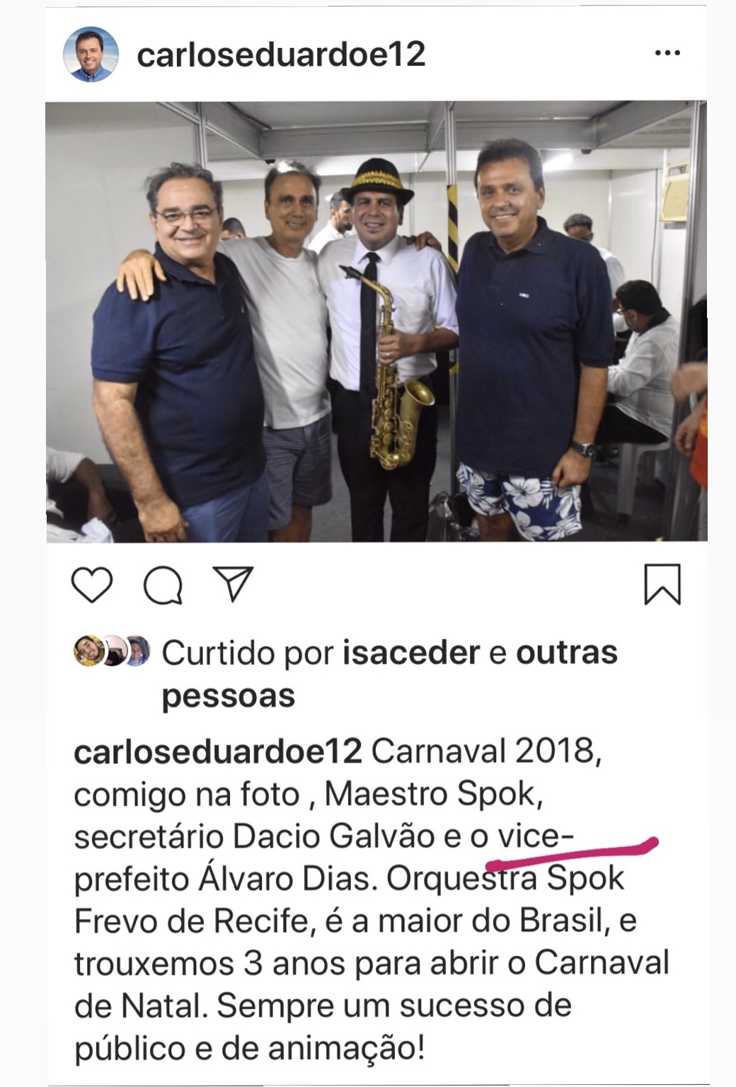 Nesta sexta-feira, um dia depois do PREFEITO Álvaro Dias abrir oficialmente o Carnaval de Natal, que tem feito crescer, Carlos Eduardo fez uma postagem de 2018 onde ele aparece como prefeito e Álvaro como vice.
