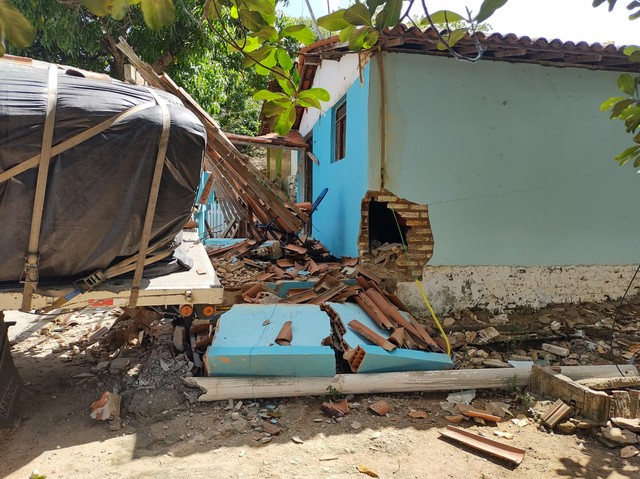 Na manobra, a carroceria acabou atingido a varanda de uma casa e destruindo parcialmente o imóvel, mas não não houve feridos. Segundo a polícia, não havia ninguém no local, na hora do acidente. A carroceria ainda tombou lateralmente e vários sacos de cimento caíram sobre a via.