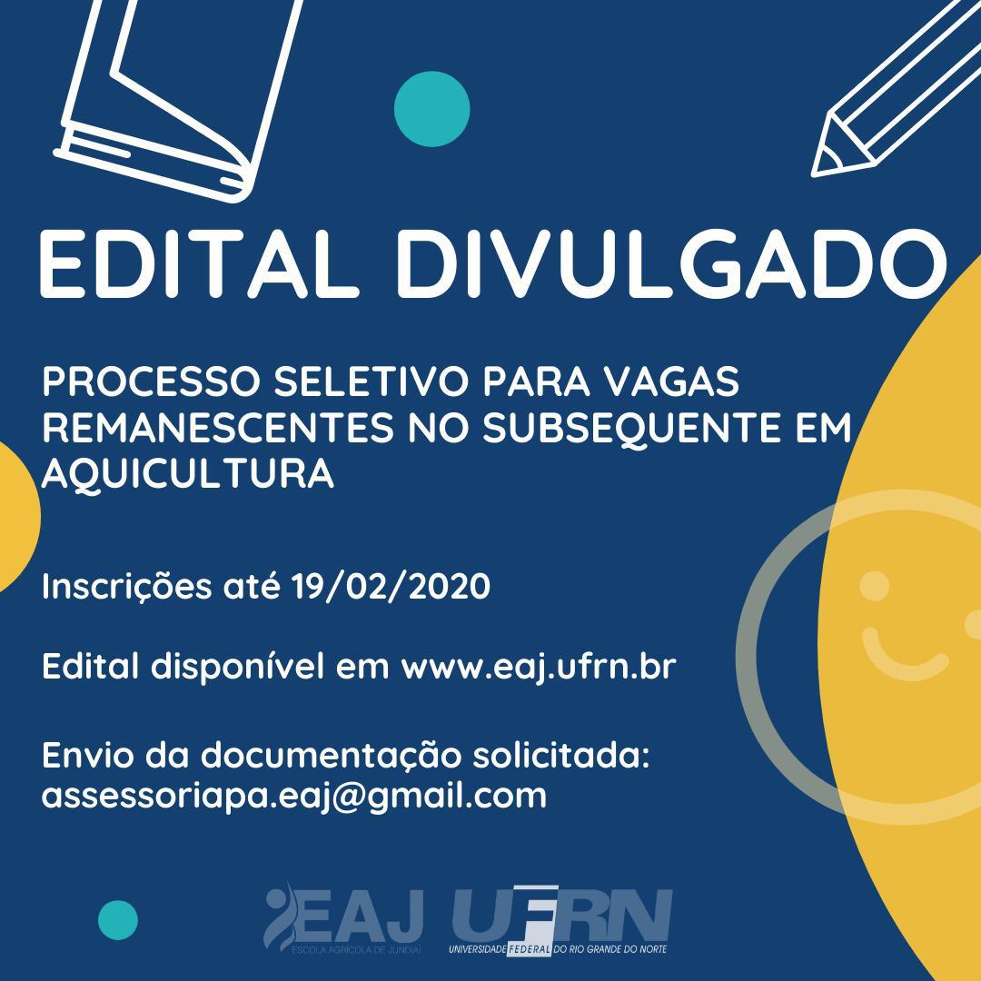 A Escola Agrícola de Jundiaí (EAJ/UFRN) ainda dispõe de oportunidades para quem deseja ingressar neste período no curso superior de Aquicultura (ramo da Zootecnia que estuda a produção racional de organismos aquáticos, como peixes, moluscos, crustáceos, anfíbios, répteis e plantas aquáticas para uso do homem).