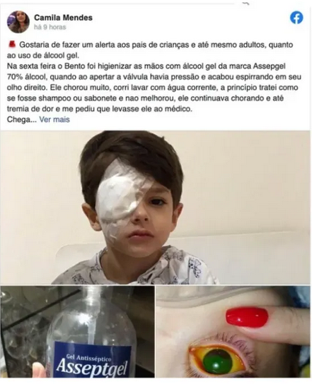 Gostaria de fazer um alerta aos pais de crianças e até mesmo adultos, quanto ao uso de álcool gel. Na sexta feira o Bento foi higienizar as mãos com álcool gel da marca Assepgel 70% álcool, quando ao apertar a válvula havia pressão e acabou espirrando em seu olho direito. Ele chorou muito, corri lavar com água corrente, a princípio tratei como se fosse shampoo ou sabonete e não melhorou, ele continuava chorando e até tremia de dor e me pediu que levasse ele ao médico”, começou ela.