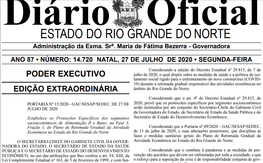 O Diário Oficial do Estado dessa segunda-feira(27) destaca a liberação da venda de bebidas alcoólicas em bares e restaurantes, a partir de 05 de agosto, seguindo o cronograma da retomada gradual da atividade econômica.