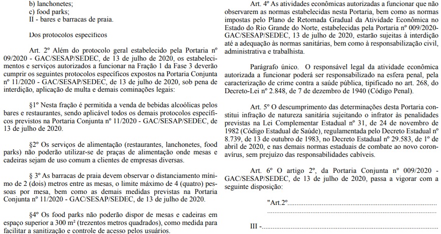 Art. 2º Além do protocolo geral estabelecido pela Portaria nº 09/2020 – GAC/SESAP/SEDEC, de 13 de julho de 2020, os estabelecimentos e serviços autorizados a funcionar na Fração 1 da Fase 3 deverão cumprir os seguintes protocolos específicos expostos na Portaria Conjunta nº 11/2020 – GAC/SESAP/SEDEC, de 13 de julho de 2020, sob pena de interdição, aplicação de multa e demais cominações legais: