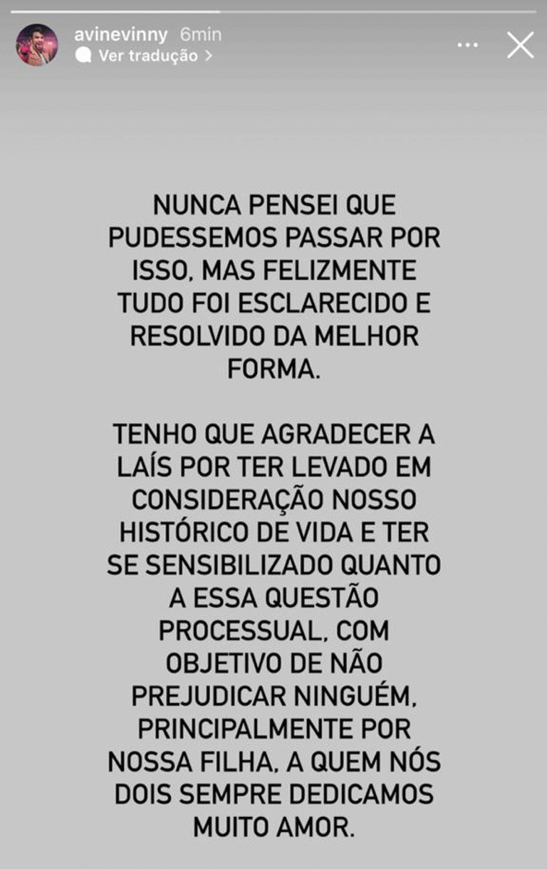 “Nunca pensei que púdessemos passar por isso, mas, felizmente, tudo foi esclarecido e resolvido da melhor forma. Tenho que agradecer a Laís por ter levado em consideração nosso histórico de vida e ter se sensibilizado quanto a essa questão processual, com objetivo de não prejudicar ninguém, principalmente por nossa filha, a quem nós dois sempre dedicamos muito amor”, publicou Ávine em sua rede social.