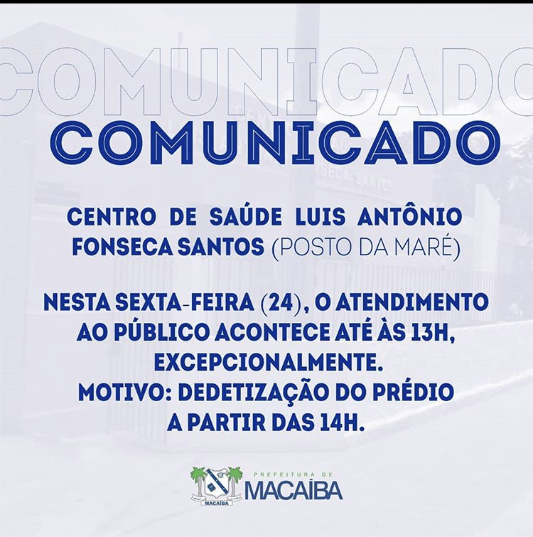 23 julho 2020 19:03 Comunicado do Posto da Maré de Macaíba sobre expediente desta sexta (24) Postado por Administrador Prefeitura de Macaíba (Via Facebook) About The Author Administrador See author's posts Compartilhe no Facebook Compartilhe no Twitter Compartilhe no Google+