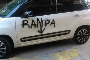 Que falta de consideração com as pessoas com necessidades especiais! Esse cidadão simplesmente estacionou seu veículo em frente a uma rampa, impossibilitando o acesso pelo local. Faltou educação, né? Como forma de vingança, alguém escreveu no carro a palavra “rampa” bem grande. Deve ter sido complicado remover essa tinta preta do carro.