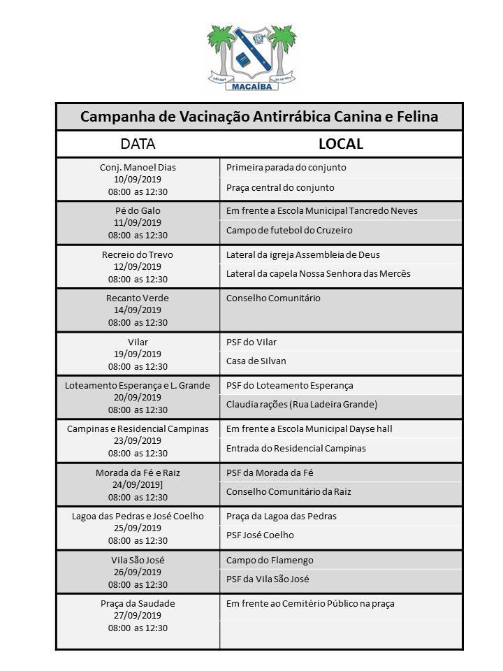 A Prefeitura de Macaíba, por intermédio da Secretária Municipal de Saúde (SMS), prossegue com a campanha de vacinação antirrábica. Hoje (10/09), a vacinação ocorre no Conjunto Manoel Dias. Amanhã (11/09), será em Pé do Galo. Na quinta-feira (12/09), em Recreio do Trevo. No sábado (14/09), em Recanto Verde. Na quinta-feira (19/09), no Vilar. Na sexta-feira (20/09), em Loteamento Esperança e Lagoa Grande.