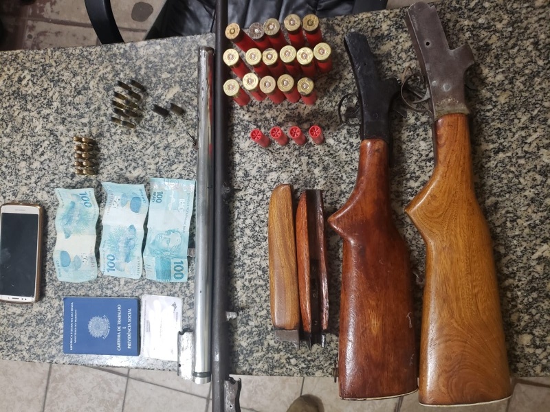 Ao realizar vistorias nas bagagens dos passageiros, foram encontrados uma espingarda calibre 12, uma espingarda calibre 28, 10 munições calibre 380, 10 munições calibre 32 , quatro munições calibre 28, 16 munições calibre 12, duas munições calibre 44, R$ 300,00 em espécie e um celular Android.