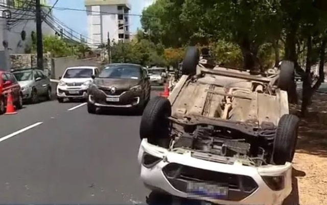 Um carro capotou no fim da manhã desta quarta-feira (10) na Avenida Rui Barbosa após um acidente que envolveu outros três veículos . A colisão aconteceu em trecho próximo à sede do Tribunal Regional Eleitoral (TRE-RN), na altura do bairro Tirol, na Zona Leste de Natal.