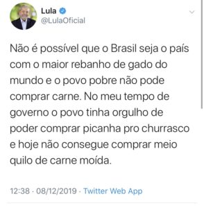 O picareta-mor Lula usou sua conta no Twitter para tentar iludir a população, disse que na época que governava a população comia picanha, hoje só tem acesso a carne moída.