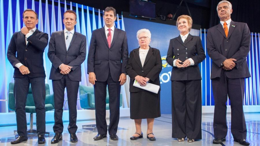Em 2016, no primeiro turno, a Globo realizou debate com seis candidatos: Doria, Russomanno, Haddad, Erundina, Marta e Major Olímpio. Imagem: Daniel Teixeira/Estadão Conteúdo