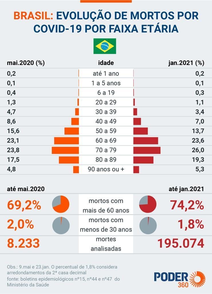 O grupo mais prejudicado é dos idosos, que corresponde a 74,2% do total de mortos pela pandemia, conforme dados analisados até janeiro. A mesma análise feita em dezembro do ano passado registrou que 74% das mortes por Covid-19 eram de idosos. As pessoas com mais de 60 anos são 13,6% da população.