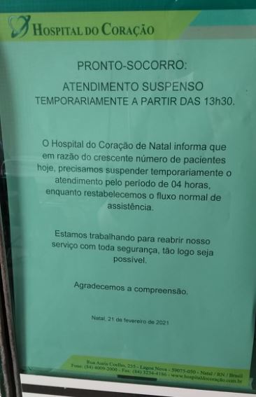 A ocupação de leitos para Covid-19 na rede particular do RN também está em níveis altos. Em consequência da alta demanda, o Hospital do Coração chegou a suspender por 4h os atendimentos no pronto-socorro, até normalizar o fluxo de assistência.
