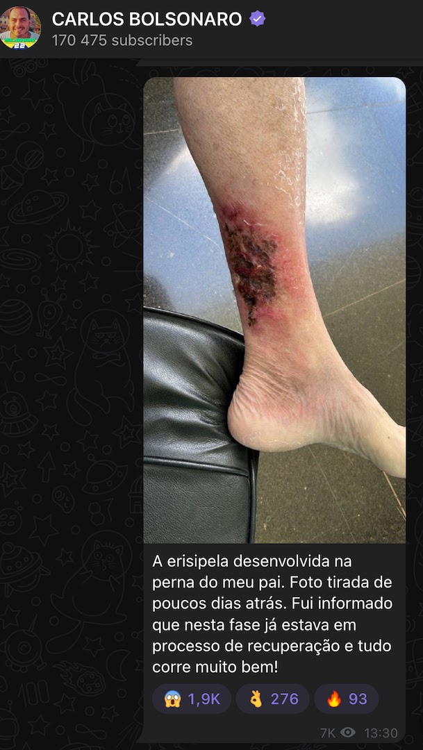 Carlos Bolsonaro publicou neste domingo (4), em sua conta no Telegram, uma foto da perna esquerda do presidente Jair Bolsonaro com a lesão causada pela erisipela.