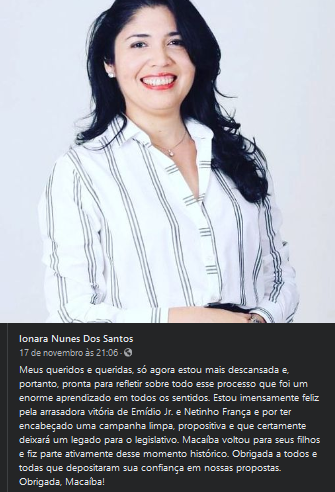 Muitos foram os candidatos que ficaram decepcionados com as urnas, como foi o caso da candidata Ionara Nunes, a candidata fez um tremendo discurso, mostrando sua contribuição na vitória esmagadora de Emídio Junior, só esqueceu-se de agradecer as 31 pessoas que acreditaram nos seus projetos e foram as urnas votar nela. Talvez a jovem ainda esteja um pouco constrangida com a votação. Veja abaixo o esclarecimento da jovem