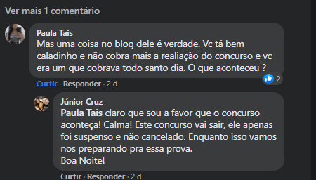 Meu amigo professor de história, disse que ninguém se preocupasse, pois, o concurso não foi cancelado, foi apenas suspenso, e ele foi mais além, disse que esse adiamento era bom porque daria mais tempo para eles estudarem. Alguns meses atrás esse mesmo professor esperneava, mas agora ficou em silêncio, e quando se manifestou veio com essa desculpa, que diga-se de passagem, é totalmente sem sentido.