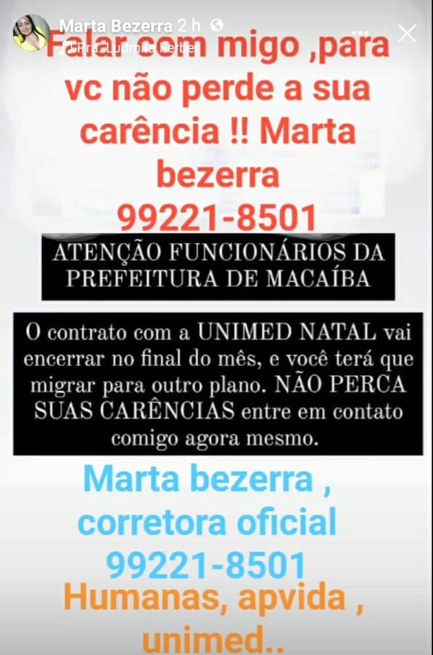A prefeitura de Macaíba cancelou o plano da Unimed que existia para os funcionários há mais de 15 anos. Muitos funcionários foram pegos de surpresa, pois até onde sabemos, a prefeitura não emitiu nenhuma nota para informar aos funcionários, que podem perde sua carência caso não migrem para outro plano no prazo. Veja a mensagem abaixo.