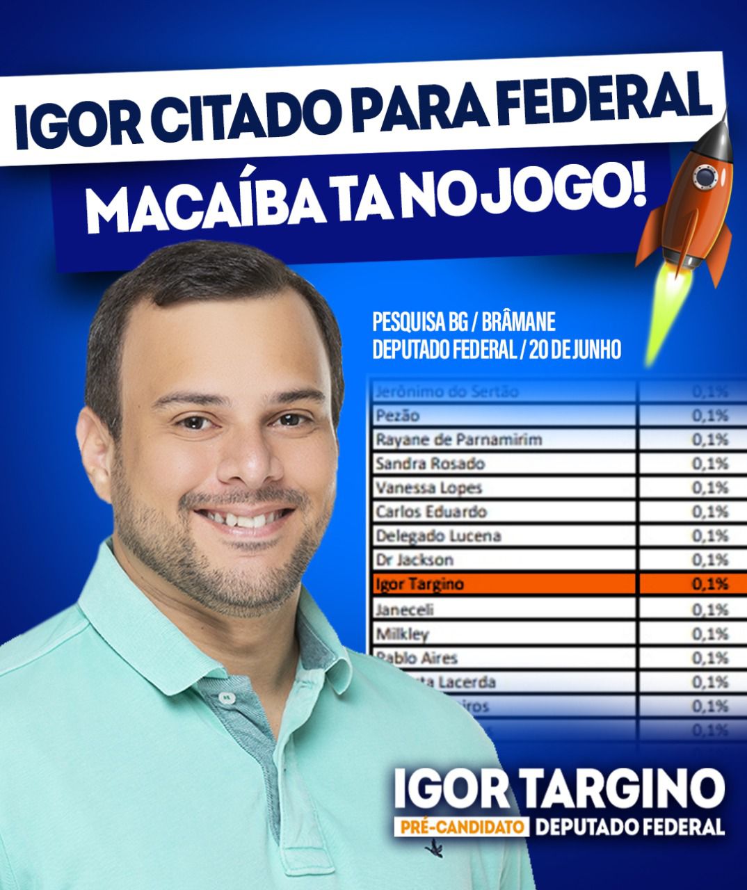 Quem está feliz da vida é o vereador Igor Targino que pontuou na pesquisa para Deputado Federal. Em conversa com o nosso site Igor expressou seu sentimento de gratidão a todos que acompanham e confiam em seu trabalho.