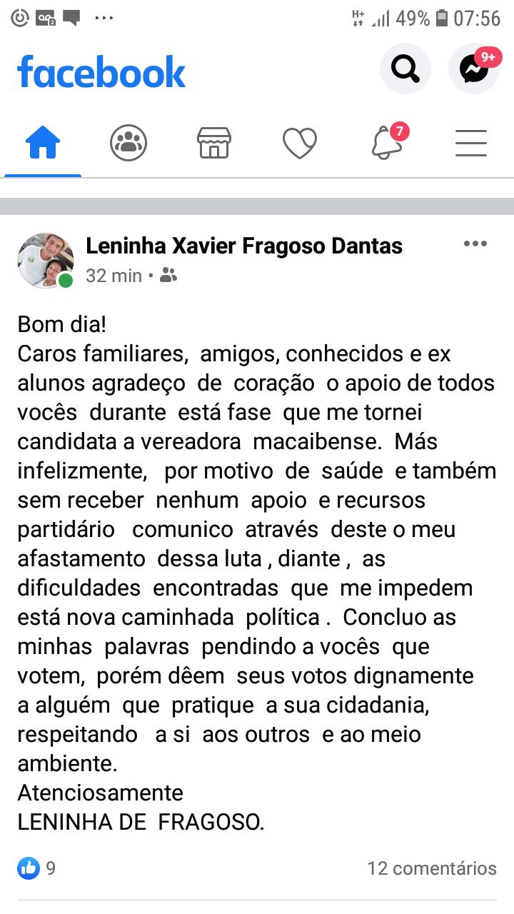Em seu pronunciamento nas redes sociais Leninha de Fragoso disse que estaria deixando sua candidatura por causa de problemas de saúde e foi apoiar o ex-prefeito Luizinho, só que muitos leitores ficaram com aquela pulga atrás da orelha. E questionaram: Luizinho é curandeiro ou médico? Veja abaixo o texto que ela jogou nas redes sociais.