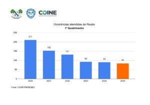 Macaíba segue colhendo os frutos de uma política de segurança pública responsável e integrada. Dados da Coordenadoria de Informações Estatísticas e Análises Criminais da Secretaria da Segurança Pública e da Defesa Social (COINE/SESED/RN) apontam que o número de roubos registrados no município durante o primeiro quadrimestre caiu de 211 em 2020 para 84 em 2025, uma redução de 60,1% ao longo de cinco anos.