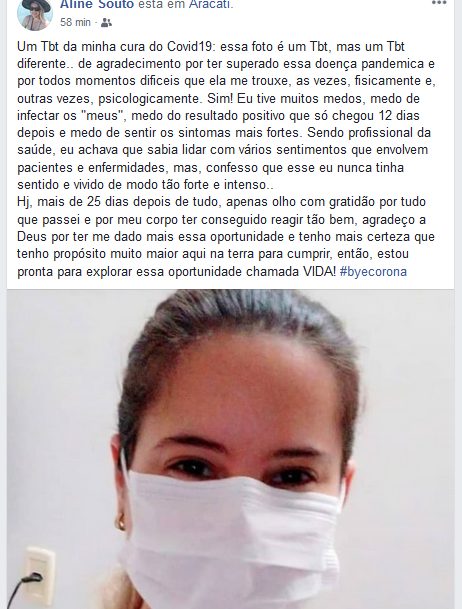 16 abril 2020 22:30 Macaibense está curada do coronavírus Postado por Administrador Aline Souto é uma das primeiras macaibenses que está curada do coronavírus. A jovem relata no seu perfil pessoal do Facebook toda a angústia e o medo que passou com uma doença que vem apavorando o mundo. Confira o texto abaixo: About The Author Administrador See author's posts Compartilhe no Facebook Compartilhe no Twitter Compartilhe no Google+