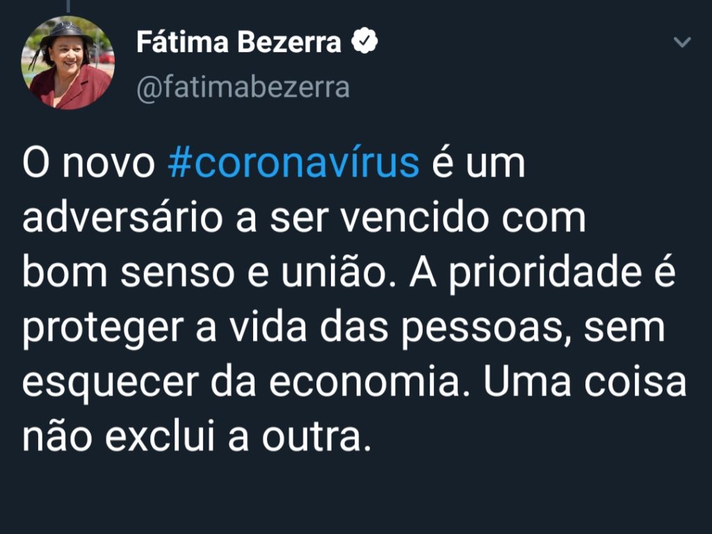 Em um dos seus posts no Twitter, ela afirmou que “é preciso proteger a vida, sem esquecer da economia”.