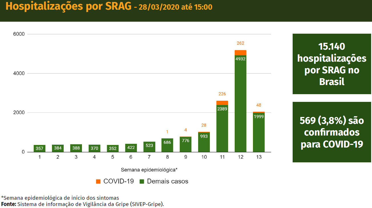 A abaixo, o número de hsopitalizações por síndrome respiratória aguda grave (sintoma mais grave da doença) e o número de pessoas hospitalizadas com confirmação de Covid-19: