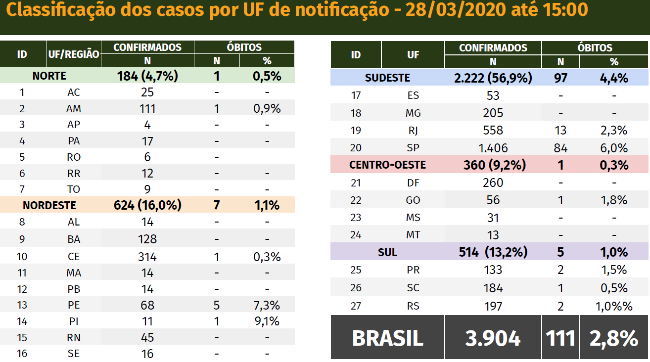 O Ministério da Saúde atualizou para 3.904 o número de casos confirmados do novo coronavírus no Brasil e o registro de 111 mortes.