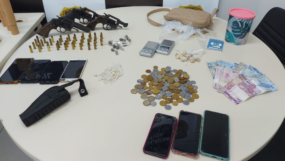 No local, foram apreendidos aparelhos celulares, diversos sacos plásticos usados para acondicionar drogas, oitos porções médias de crack, uma porção de maconha, moedas, dinheiro fracionando em notas de R$ 2,00 e R$ 5,00, além um caderno de anotações possivelmente relacionadas à contabilidade de tráfico de drogas.