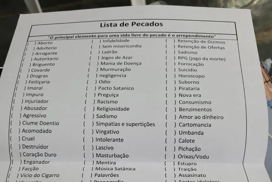 Durante um retiro de uma igreja evangélica no Distrito Federal, no último fim de semana, jovens receberam o que foi chamado de uma “lista de pecados”. Entre os itens, “homossexualismo”, “lesbianismo”, além de umbanda, benzimentos, primeira comunhão, horóscopo e até RPG, que é um tipo de jogo
