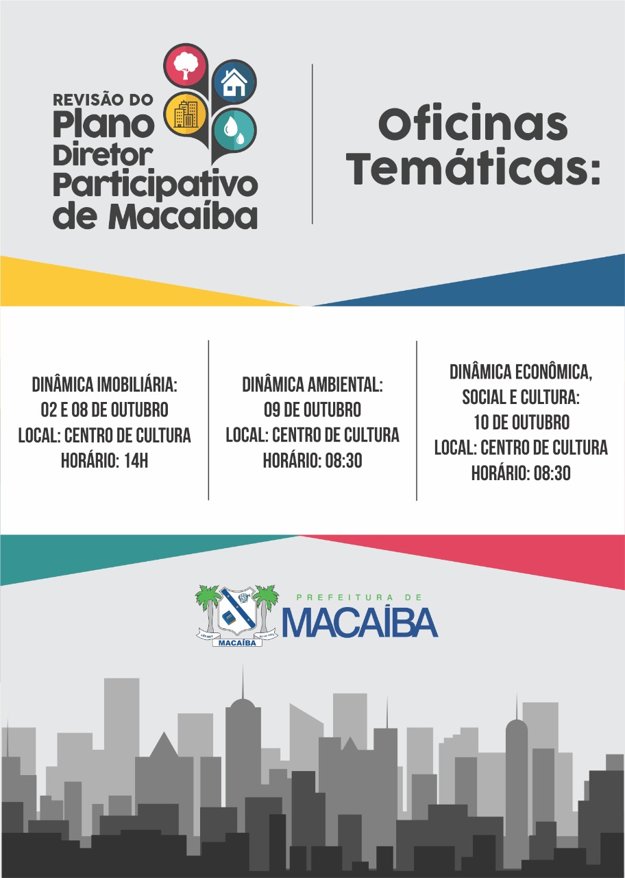 Dando sequência aos debates sobre a revisão do Plano Diretor, que está sendo discutido nas comunidades, a Prefeitura de Macaíba promove a partir desta quarta-feira (02/10) uma série de oficinais temáticas no Centro de Cultura, que servirão para subsidiar o diagnóstico da atual situação do município.