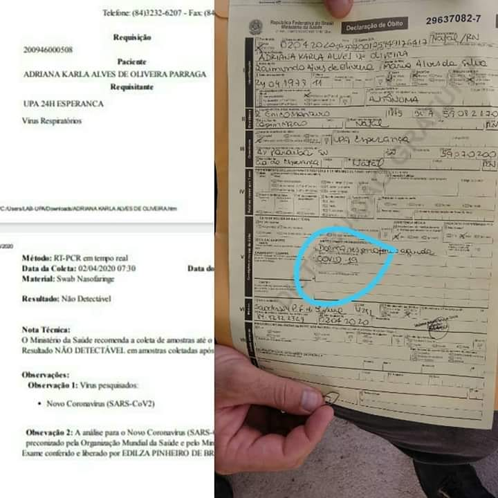 Familiares prometem tomar providências na justiça, após declaração de óbito afirmar causa morte de membro do sexo feminino como Covid-19, e tomar conhecimento, conforme destaque em fotos e íntegra de postagem, resultado negativo para o novo coronavírus: