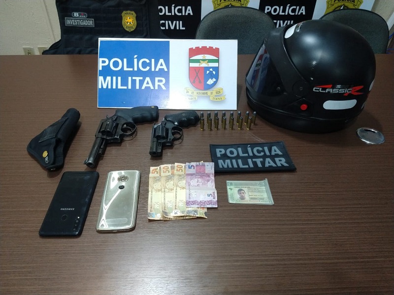 Os policiais estavam em patrulhamento na área de Lagoa de Pedras, quando visualizaram os dois suspeitos em uma motocicleta, foi dada voz de parada e realizada a abordagem, onde foram localizadas duas armas de fogo, tipo Revólver, calibre .38, devidamente municiadas.