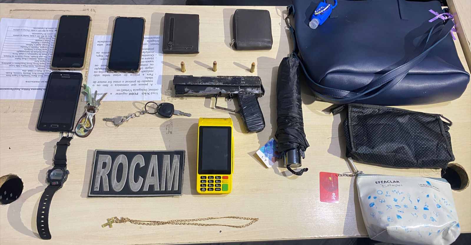 Na abordagem, foram encontrados na posse dos meliantes 03 aparelhos celulares, 01 arma de fogo artesanal, calibre 38, municiada, 01 maquineta de cartão, 01 relógio, 02 carteiras e 01 bolsa com pertences pessoais de uma das vítimas do crime. O veículo roubado, acima mencionado, foi localizado, após diligências policiais, também no bairro Parque Industrial, município de Parnamirim/RN.