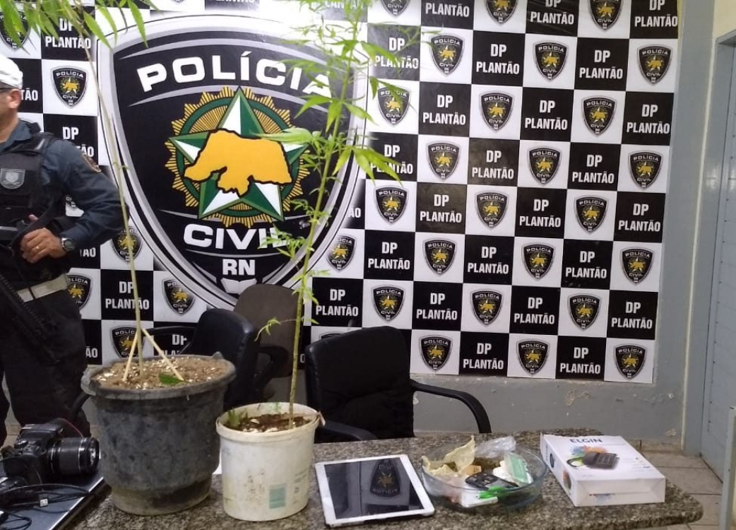 No local, os policiais localizaram a advogada com mais droga e dois pés de maconha, que eram cultivava em jarros.