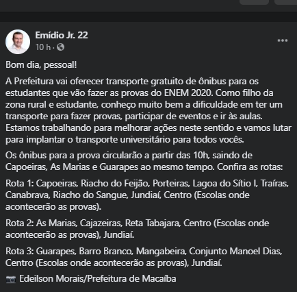 Hoje, prefeito, estamos vendo outro Emídio, sem esquecer sua mudança de postura em relação a alíquota do projeto de reforma da previdência. Fico aqui pensando nos milhares de macaibenses que pagaram a inscrição, estudaram, dedicaram seu tempo, abriram mão do lazer e da família, se preparando para essas provas. Falar em pandemia agora? Recentemente passamos por uma eleição, onde multidões foram às ruas, No mais, Macaíba dispõe de vários prédios públicos, escolas, ginásios, prédios do Governo do Estado, sendo possível a realização do concurso com as devidas medidas protetivas, lembrando que a última eleição foi mantida, quando tínhamos mais de 50 mil eleitores aptos a votar. Sem falar no ENEM que está mantido para milhões de brasileiros. Finaliza Igor Targino, vereador de Macaiba.