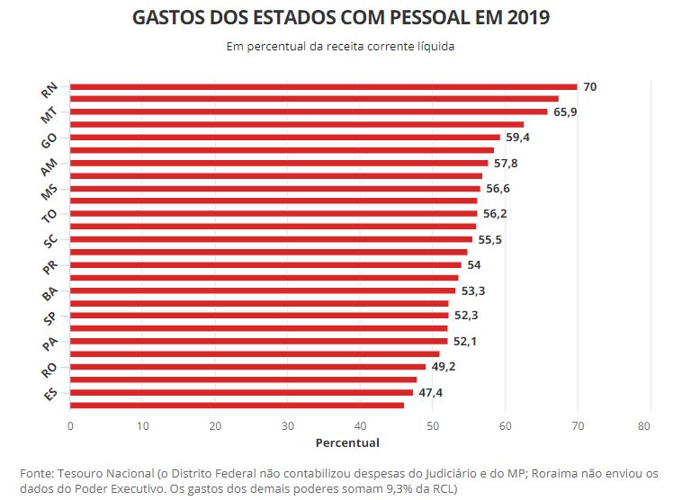Dado muito preocupante, de acordo com um relatório divulgado pelo Tesouro Nacional, o RN utilizou 70% da sua Receita Corrente Líquida (RCL) com o pagamento de folha em 2019. Foi o maior gasto percentual entre todos os estados. O RN estourou o teto para esse tipo de despesa estabelecido pela Lei de Responsabilidade Fiscal, que é de 60%. Esse é o desafio, como estabilizar as contas do governo, até agora o governo Fátima Bezerra não fez nada para diminuir gastos com pessoal.