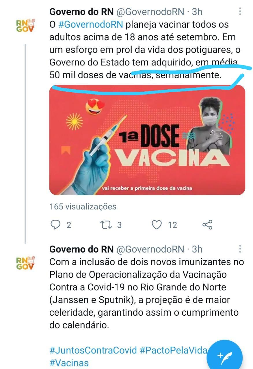 Não existe vergonha ou pudores na comunicação do governo Fátima Bezerra. A mentira é uma obsessão permanente com um simples intuito de enganar a população. Em um Twitter, a comunicação picareta a serviço de Fátima, disse que o governo do estado tem adquirido (ADQUIRIDO) 50 mil doses de vacinas por semana. Nunca chegou ao estado do RN uma única dose de vacina adquirida pelo estado. Fátima trabalha acreditando na ignorância do Potiguar.