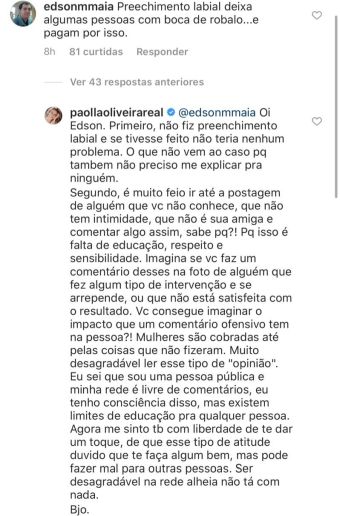 Em seguida, Paolla respondeu escreveu um comentário reprovando o comportamento do internauta. “Falta de educação, respeito e sensibilidade”, afirmou a atriz.