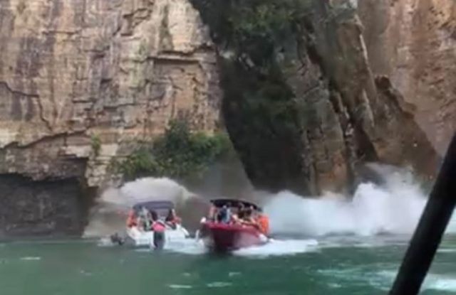 Um vídeo que circula nas redes sociais mostra o momento em que um grande bloco de rocha desaba na água, onde é possível ver três lanchas, das quais duas estavam próximas do desabamento.