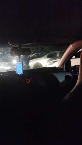 Por volta das 23h, vários carros de transporte de passageiros voltando na contramão da pista de saída do aeroporto.